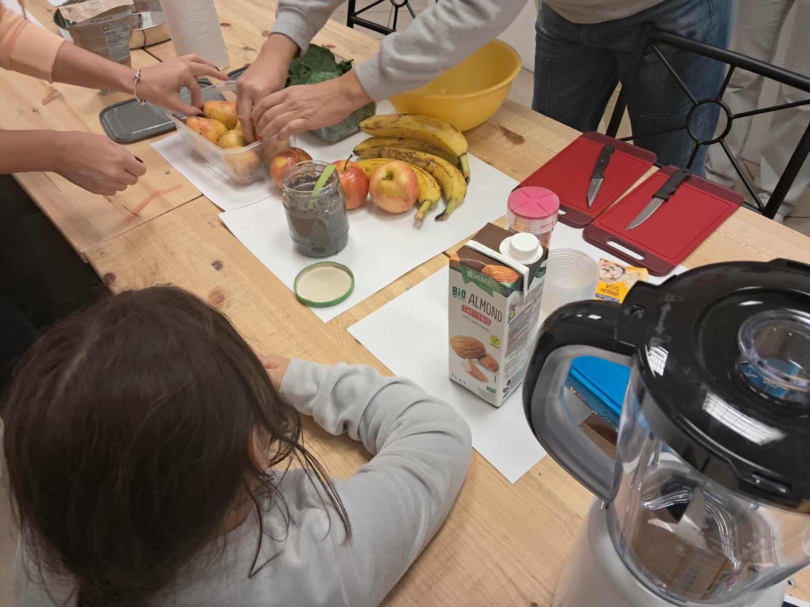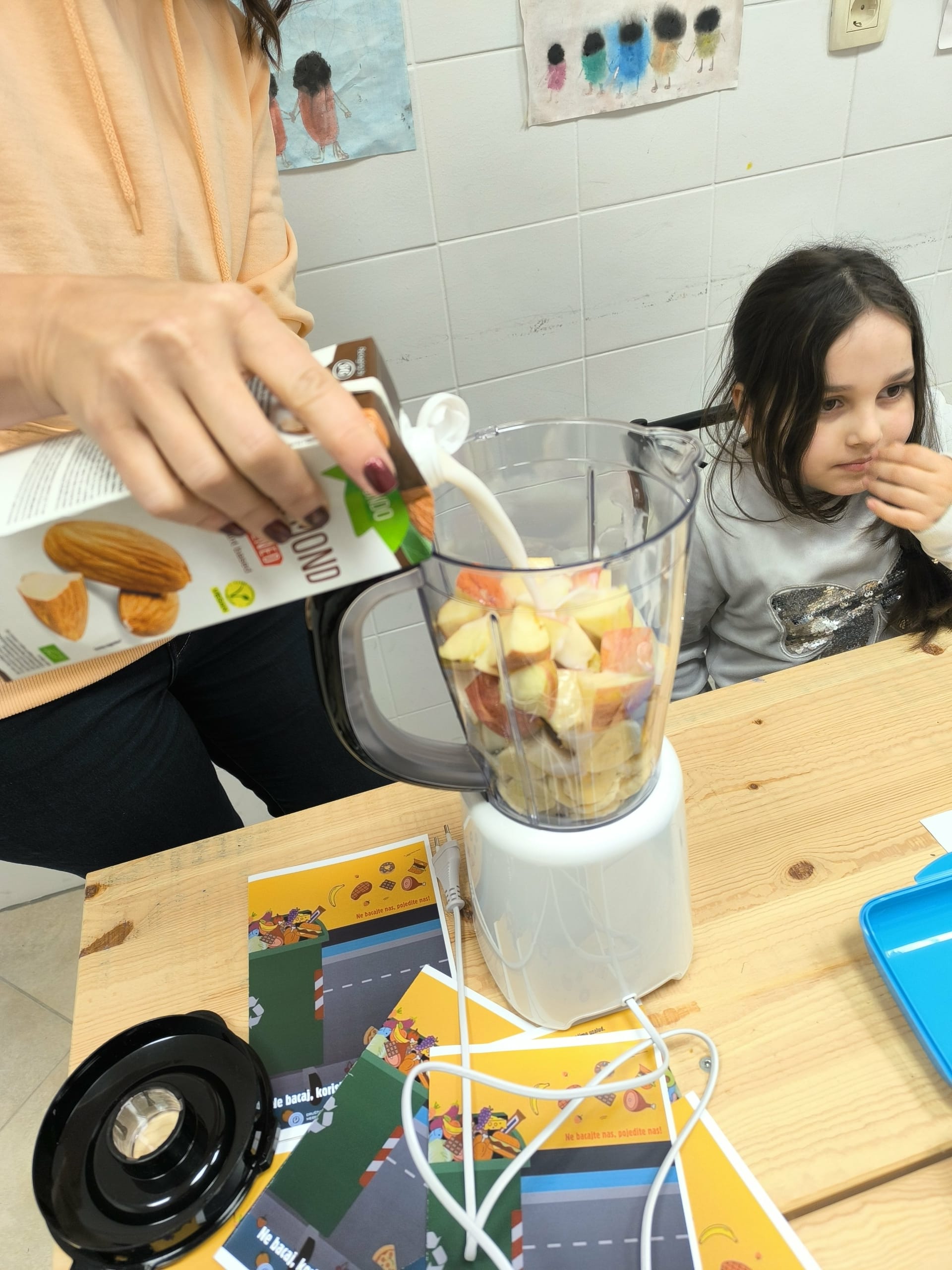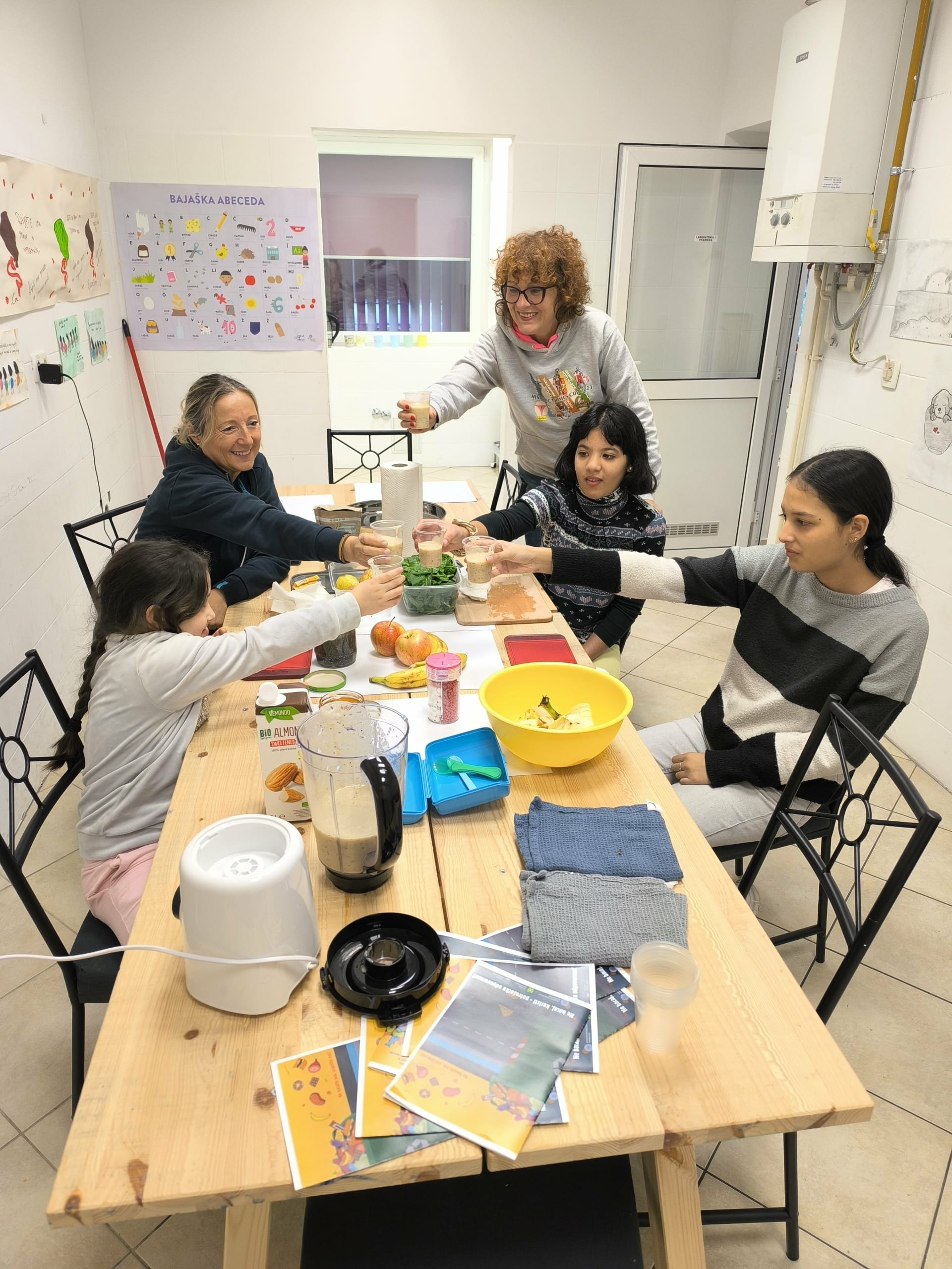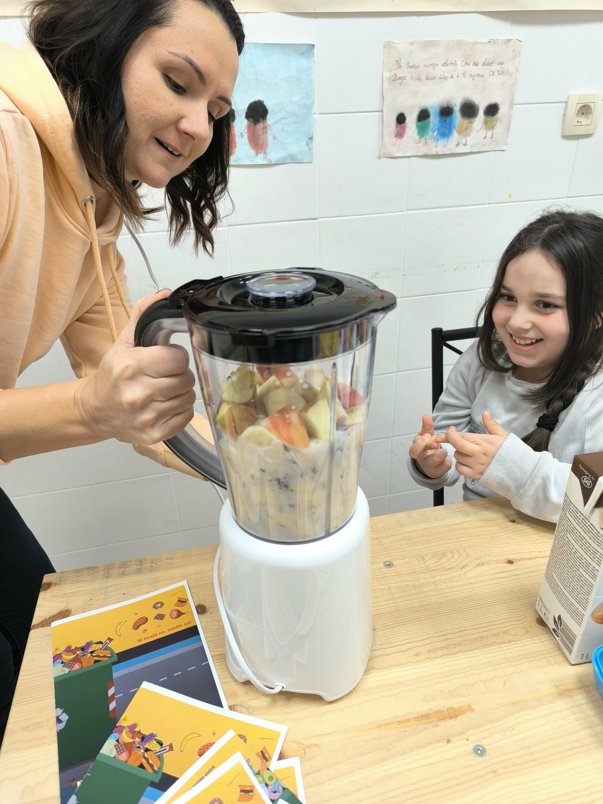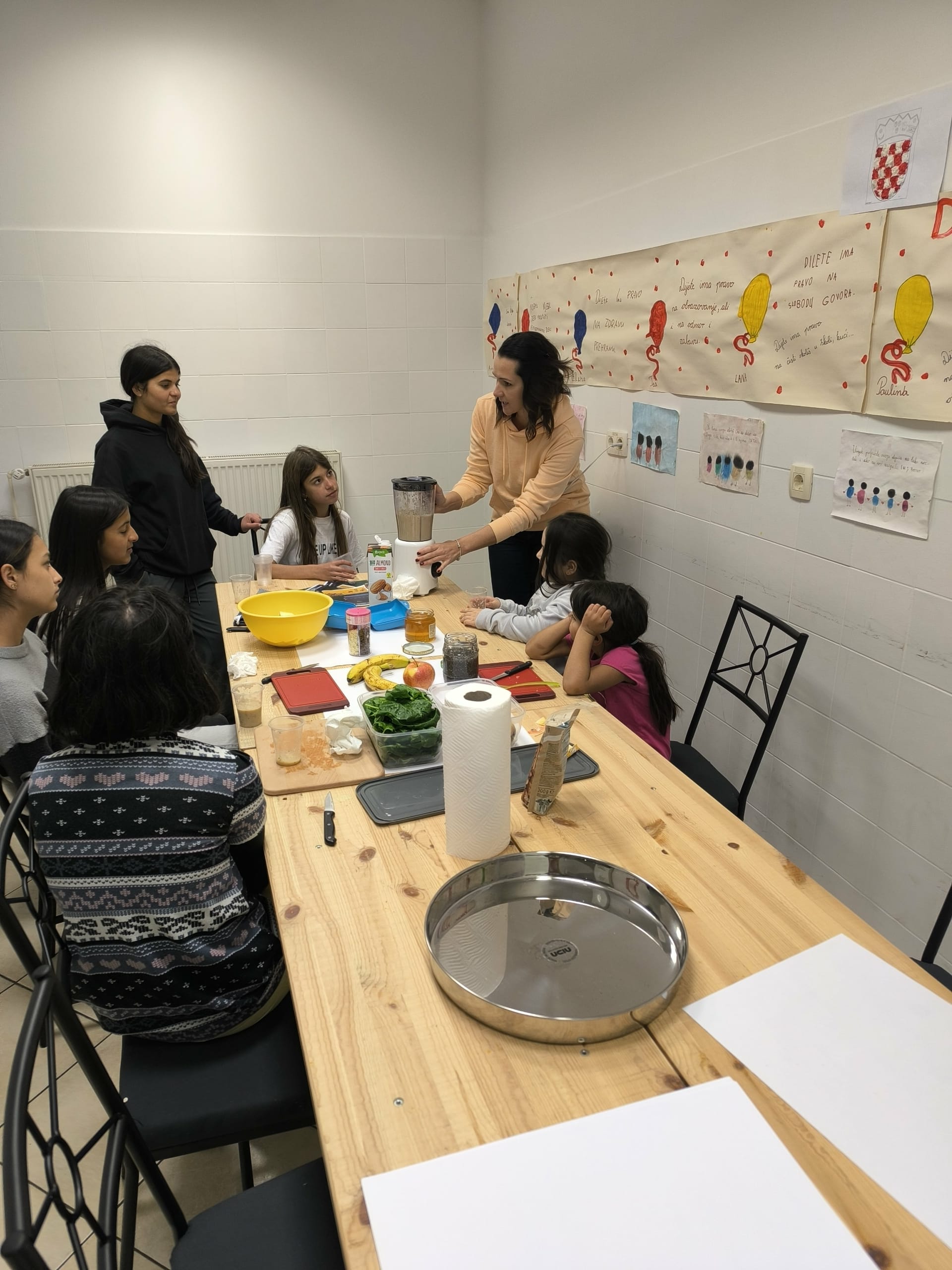 Praktični dio radionice bio je najzabavniji: zajedno s djecom pripremili smo tri vrste smoothija – zeleni, crveni i krem. Koristili smo banane, jabuke, špinat, kruške, kivi, maline, bademe, chia sjemenke, mlijeko i bademovo mlijeko. Nakon miksanja, djeca su svoje smoothije ukrašavala dodacima poput čokoladnih mrvica i zlatnog praha.